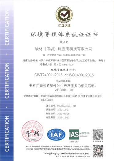 駿材磁應用科技有限公司獲得ISO14001認證,品質管控能力得到增強